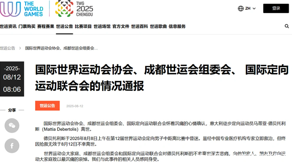 寰宇分解会虽然不如奥运会的规格那么高,但雷同诱骗了寰宇各个国度的分解员来参赛。就在近日,成齐寰宇分解会官方公布了一条哀悼的音书。在定向越野须眉中距离比赛手艺,意大利分解员德贝托利斯被发咫尺比赛场上失去意志。之后德贝托利斯被动切救治。虽然历经顶尖医疗机构抢救,但德贝托利斯如故可怜物化。恶耗传出,网友们也纷纷吊问!咫尺,世运会官方并莫得公布具体的细节。