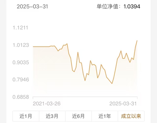 上述清盘基金的持有东谈主共享的净值弧线(下图)高傲:由于险些是自2021年一季度的牛市高点起步运作,该居品的净值发挥时往时几年内,更多高傲一轮轮的回撤之势。基金净值最低一度靠拢0.70元。
